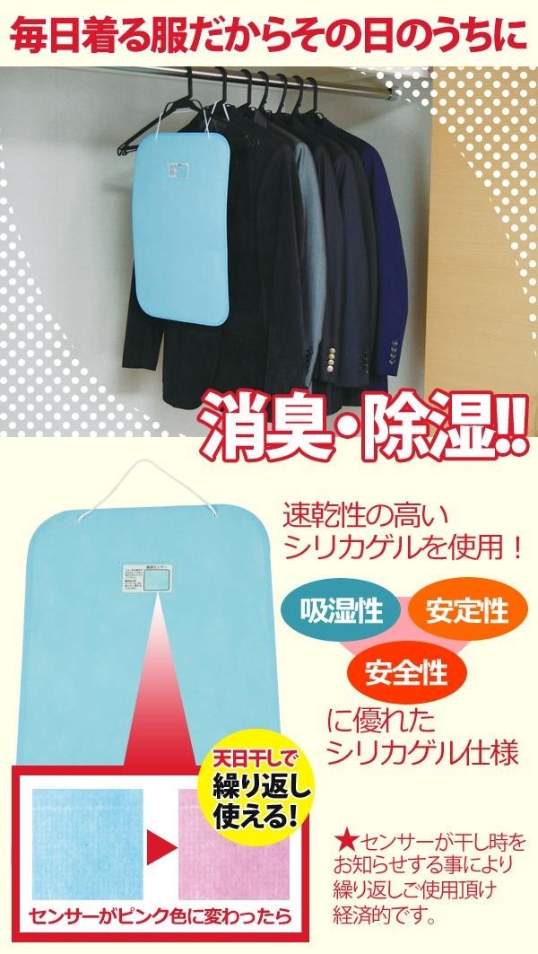 | 速乾性、吸湿性の高いシリカゲルを使用、ハンガーにかけるだけで服の消臭・除湿効果があります。センサーの色が変化したら、天日干ししていただくことによって繰り返しご利用いただけます。 |