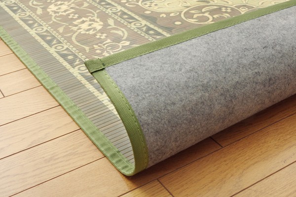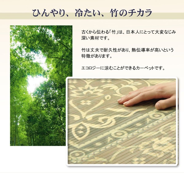 竹ラグとしては珍しいエレガントなクラシック柄のカーペットです。無地やシンプルな柄が多い中、あえてクラシック柄をプリントすることにより、竹のひんやりとした質感を楽しみながら、洋風な家具にも合わせやすい商品です。裏地には床面を傷つけにくいフェルトを使用しています。竹は他の木材に比べると格段に成長が早く(3~5年で成竹)、持続的生産が可能な環境に優しいサスティナブルな素材です。
