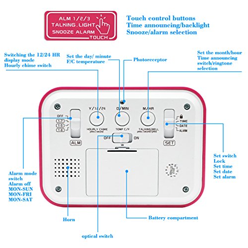 Large digit display, time is clearly visible in the viewing angle of 45-60 degrees. Simple settings: Just slide and press, you can complete all the settings. Convertible ℉ ℃, 12HR 24HR with simple operation.