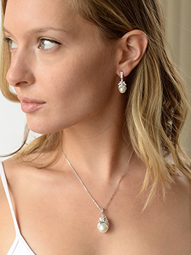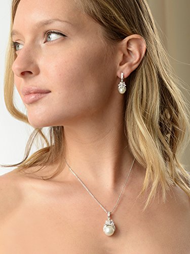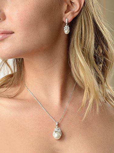 This regal wedding necklace and earrings set from Mariell sparkles with beautiful vintage style cubic zirconia baguettes and soft cream pearls. Make an unforgettable grand entrance in this heirloom-quality antique reproduction necklace set, perfect for any special occasion. With glass-based organic shell pearls, Genuine Silver Platinum plating and AAAAA grade Cubic Zirconia, this necklace set has that unmistakable look of fine jewelry at a fraction of the cost. This top-selling jewelry set is a stunning look for brides, bridesmaids and mother of the bride. The necklace chain measures 16" and boasts a 1 1/4" h pendant featuring a 12mm soft cream pearl. The dangle earrings are 3/4" h featuring 8mm glass-based pearls and glistening zirconium baguettes. We promise you'll adore this glamorous jewelry set or your Money-Back. Treat yourself or someone you love to some seriously gorgeous sparkle at a fabulous low price. Enjoy Mariell's exclusive 100% Risk-Free Purchase and Lifetime Guarantee.Feature