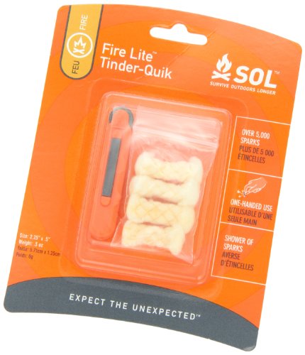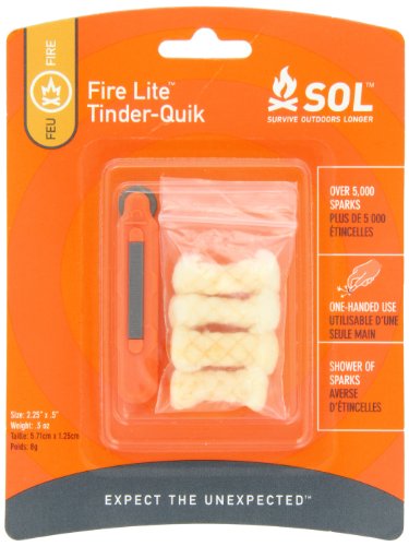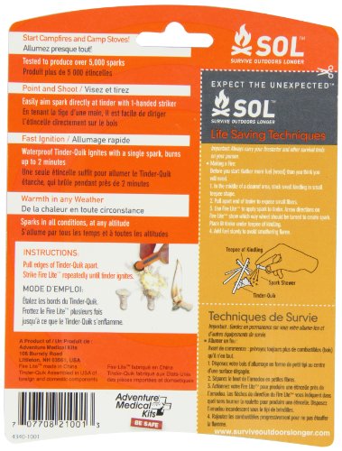 -. Binding : Misc. -. Brand : Adventure Medical Kits -. Color : One Color -. Department : unisex-adult -. Feature : Includes a one-hand fire starter. Tested for over 5,000 sparks. Waterproof and windproof Tinder Quik just needs a single spark to ignite, and then burns for up to two minutes. / Imported. -. Label : ADVENTURE MEDICAL KITS -. Manufacturer : ADVENTURE MEDICAL KITS -. NumberOfItems : 1 -. PackageQuantity : 1 -. ProductGroup : Sports -. ProductTypeName : SPORTING_GOODS -. Publisher : ADVENTURE MEDICAL KITS -. Size : _DELETE_ -. Studio : ADVENTURE MEDICAL KITS -. Title : ADVENTURE MEDICAL KITS SOL Fire Lite with Tinder Quik