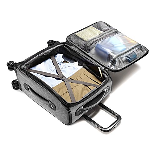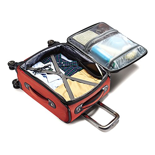 -. Feature : Four multi-directional dual spinner wheels for easy mobility. Rolls upright so there is no weight on your arm or shoulder. / Large, self-mending #10 coil zippers for flawless closure / Multiple exterior and interior pockets keep you organized / Spinner carry-ons have zippered side pocket for magazines, umbrella, or a beverage container
