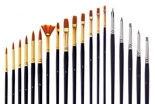 - Contents: Brushes in Round #2,4,6,8,10,12. Flat #2,4,6,8,10,12. Filbert #6, Fan #6. Color Shapers Size #2 in Cup Round, Cup Chisel, Taper Point, Flat Chisel and Angle Chisel.