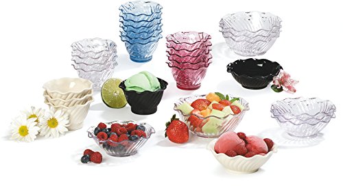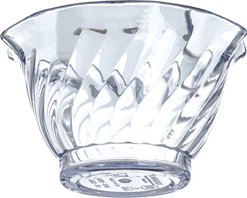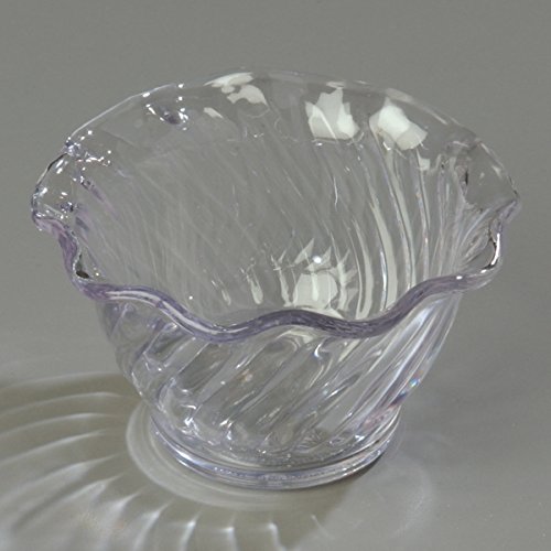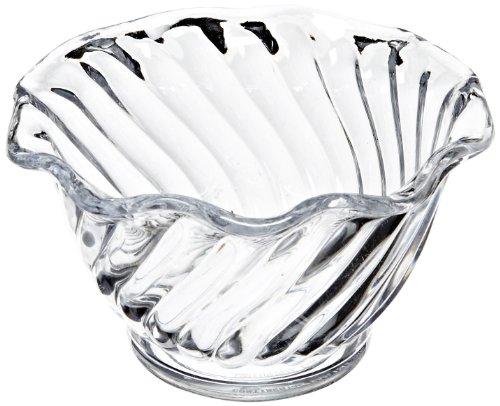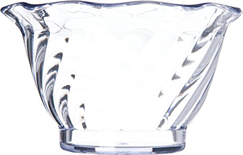 Carlisle tulip dessert dish. Ideal for serving ice cream, puddings, salads and more. Easily stack with similar glass or plastic dessert dishes. Made of break-resistant SAN. NSF listed. Made in USA. Dishwasher safe. 5.4 fluid-ounces capacity. Measures 3-3/4-inches diameter by 2-3/16-inches height. 1.62-inches base diameter. Clear color.Feature