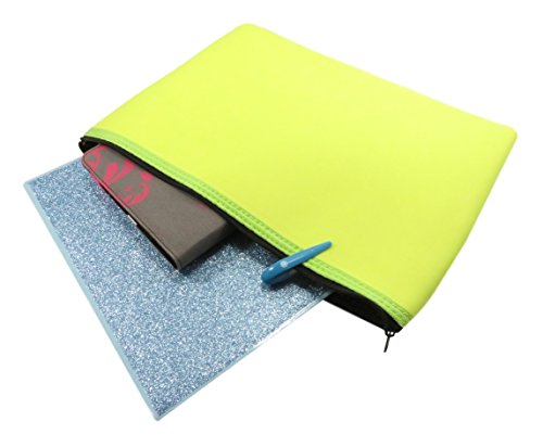 THE SPECIFICS: Set of 2 zipper bags made of polyester measuring 13" x 10" (large); 11.25" x 8.75" (medium) in neon green. Tablet, highlighter, and folder are for demonstration purposes only and not included.
