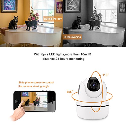2MP advanced optical lens, 6 IR LEDs and IR night vision distance is up to 32ft, 107°super wide visual angle adjustable viewing angle with 355°pan and 110°tilt. Support motion detection / alarm, and upload pictures to your phone in time, guard the family safe.