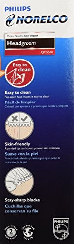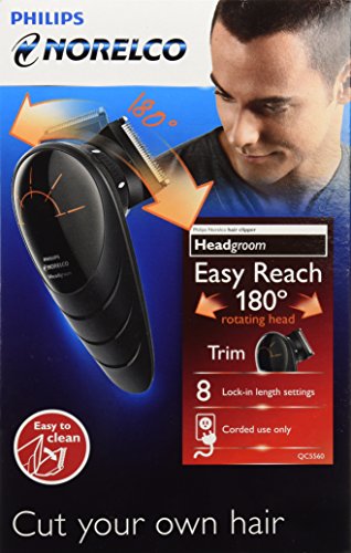 -. Binding : Health and Beauty -. Brand : Philips Norelco -. EAN : 0075020031167 -. Feature : The exclusive 180º rotating head makes it easy to reach even the most difficult spots / 8 locking length settings from 15/32 inch to 19/32 inch / The rounded edges on the blades and comb reduce skin irritation for a smooth, comfortable trim / The high quality stainless steel trimmer blades are self sharpening / Corded use only -. IsAdultProduct : 0 -. Label : Norelco -. Manufacturer : Norelco -. Model : QC5560 -. MPN : QC5560 -. NumberOfItems : 1 -. PackageQuantity : 1 -. PartNumber : QC5560 -. ProductGroup : Beauty -. ProductTypeName : BEAUTY -. Publisher : Norelco -. ReleaseDate : 2013-02-14 -. Studio : Norelco -. Title : Philips Norelco QC5560/40 Do-It-Yourself Hair Clipper -. UPC : 885185358784 -. Warranty : FULL 2 YEAR WARRANTY