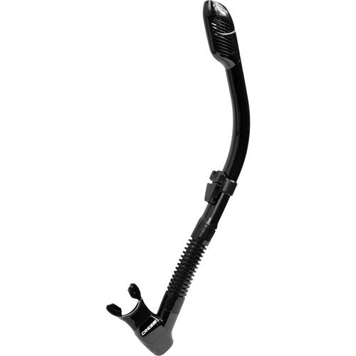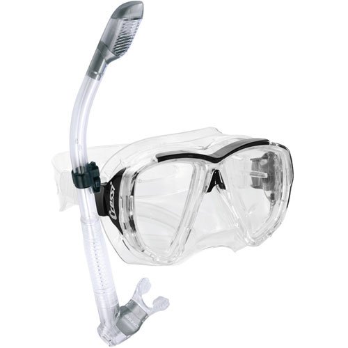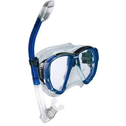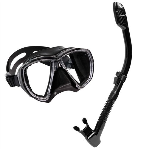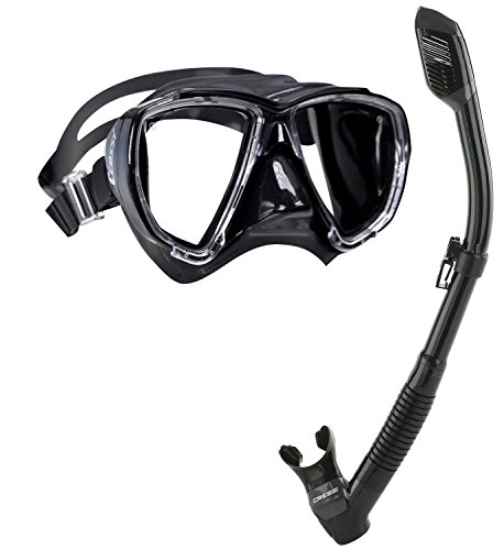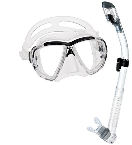 The Cressi Big Eyes Mask with Dry Snorkel is an innovative new mask design by Cressi. This mask and snorkel set will far exceed the expectations of divers and snorkelers alike and is an exceptional mask and snorkel package for those warm, tropical vacations.The Cressi Big Eyes Mask features an internationally patented raked lens design as opposed to a more traditional parallel lens position. This places the lenses in an inclined position. Meaning, that the bottom of the lens is closer to your face and the top is farther away. This unique design increases all-around visibility but drastically increases downward view by more than 30% when compared to traditional masks.The mask skirt is comprised of 100% soft liquid silicone for supreme comfort and an incredible seal. Ultra-clear tempered lenses will assure impeccable views and incredible durability. The frame is constructed from techno-polymer for added strength and durability. The mask also features a fully adjustable mask strap and tilting buckles that allow you freedom and complete customization for maximum comfort.The dry snorkel features a pliable, contoured tube and a flexible, corrugated elbow that provides added comfort by relieving pressure from your jaw. This also increases durability by allow the snorkel to bend and compress without fracturing. The dry top means that water will not enter the snorkel when submerged or when water splashes over top of the snorkel. Credit is due to a small flap