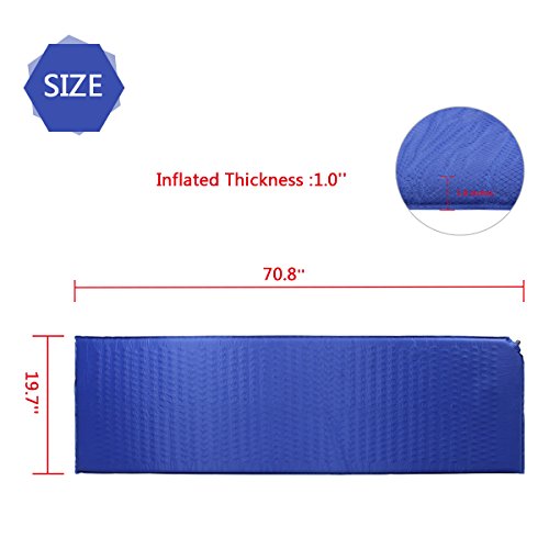 Unfolded area: 70.8" x 19.6", Thickness: 1.0", Carrying bag size: D 5.9" x L 11.0", Weight: 2.2lb. Lightweight and portable. Automatic inflatable.