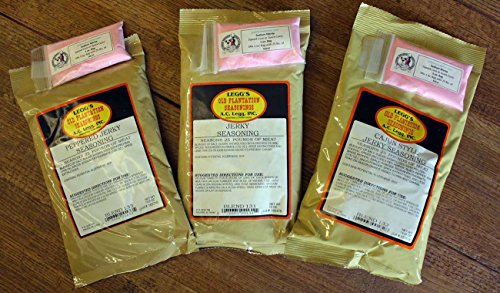 -. Feature : 1 Bag of AC Legg Traditional Jerky Seasoning, 1 Bag of AC Legg Peppered Jerky Seasoning and 1 Bag of AC Legg Cajun Jerky Seasoning. Enough Jerky Seasoning for 75 lbs. of Meat. / Very Popular Jerky seasoning for Wild Boar, Beef, Venison, Elk, Moose, Pork, Turkey, Axis and Caribou / Comes with 1 Oz. Packet of (Pink) Sodium Nitrite. Just mix this in with your bag of Jerky seasoning. / Use for beef or deer. Formulated for restructured or solid muscle. Can be used for vacuum tumble, soak or dry rub. / Can be used in a vacuum tumble, as a soak, marinade, or a dry rub.
