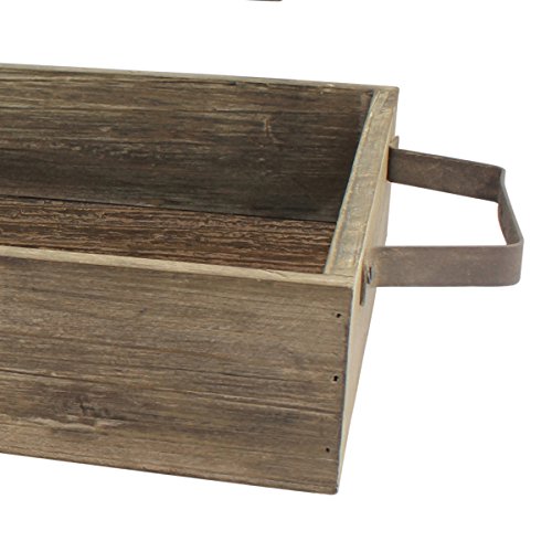 Rustic serving tray set features a lightly distressed rectangular natural wood base and sturdy rust colored metal handles for a vintage feel