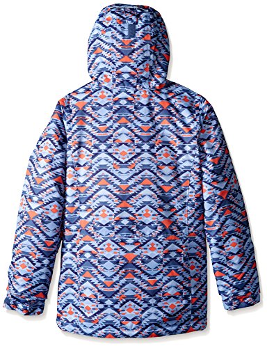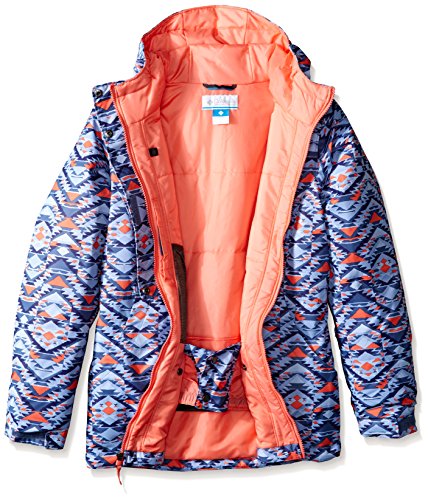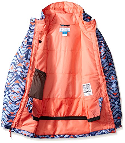When it's time to pack up the ski and snowboard gear and get out of dodge, don't forget to bring along the vibrant style and cold-weather protection of the girls' Columbia® Kids Snowcationâ"¢ Nation Jacket. Regular Fit is an easy, lightly relaxed fit for comfortable range of motion. Omni-Techâ"¢ shell:• Two-layer design with plainweave outer and waterproof membrane.• Waterproof, windproof and critically seam-sealed protection.• Breathable design allows passage of moisture-vapor from perspiration. Microtemp XF II insulation:• Polyfill insulation offers warmth without excessive bulk.• Crimped design increases surface area for improved warmth retention.• 100 g/m² fabric weight. OUTGROWNâ"¢ grow system extends sleeves for cross-season wear. Attached storm hood with elastic binding and adjustable, hook-and-loop back. Front zip with outer, half-coverage snap-button storm flap. Long sleeves. Hook-and-loop tab cuffs. Zip ski-pass pocket at the left wrist. Zip hand pockets. Inner mesh goggle pocket. Snap-back powder skirt with silicone-taped elastic binding. Straight hem. Body: 100% polyester;Insulation: 100% polyester;Lining: 100% nylon. Machine wash and tumble dry.Feature