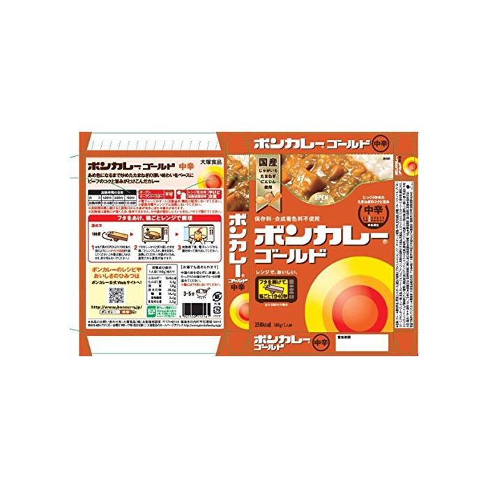 원재료:야채(감자(유전자조 교환이 아니다)고, (당근)인삼)고, 소테 오니(귀신) 온,소맥분,쇠고기,식용유지,설탕,후루츠《차츠네》,bouillon(비프,치킨,포크)고, 카레분,식염,카레 Paste,사과 Paste,젖 등을 주원료라고 하는 식품,유제품,코코넛 밀크,우스타 소스,향신료,효모 엑기스,echalote Paste/조미료(아미노산등)고, 증점제(가공 전분)고, 카라멜 색소,신맛료,파프리카 색소,사과 추출물,향료,(일부에 밀유 성분 쇠고기 대두 닭고기 바나나 돼지고기 사과를 포함한다)