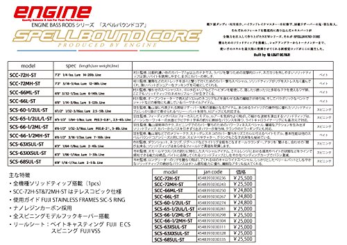 ENGINE/엔진SPELLBOUNDO CORE/스펠 바운드 코어 SCC-72H-ST◆전장(ft):7피트2인치◆자중(g):135◆루어 중량(g):7-28◆적합 라인(lb):14-20◆액션:Fast◆B/S:베이트★무라카와 감수.비교적 약간 진한 커버에 7g이상의 텍사스,러버 더를 쏘기 위한 공격 적 로드.negative 카 re를 빼기 쉬운 솔리드 T《푸》는 깊은 바이트를 유발하기 쉽고, 확실히 커버의 부산물.