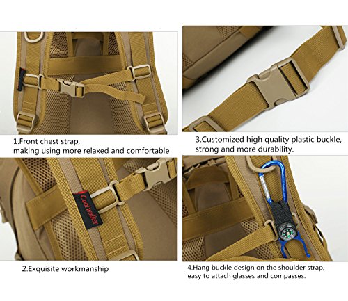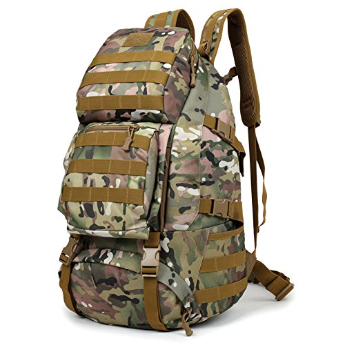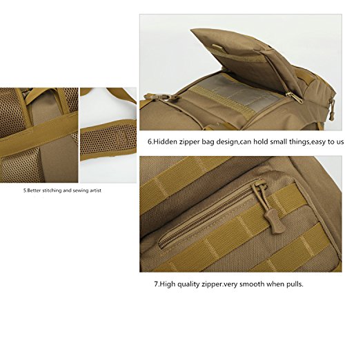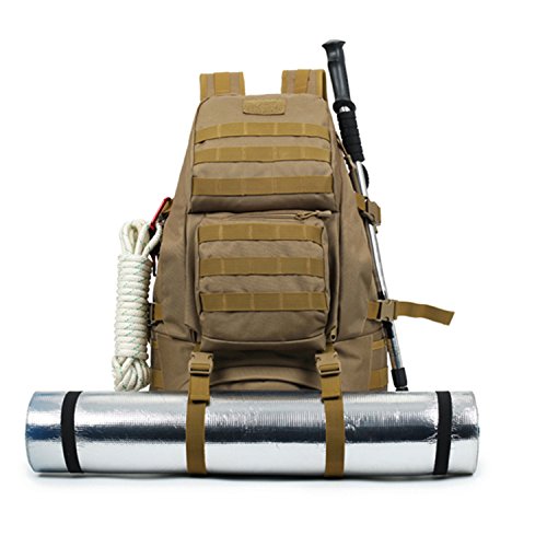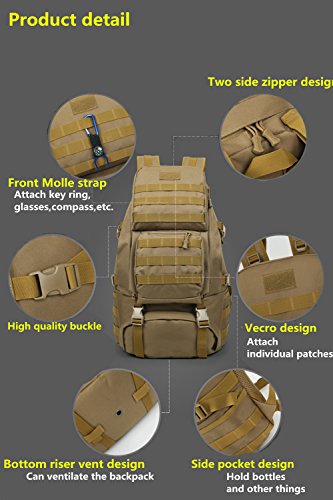 -. Feature : Material: 12.99"L x 5.91"Wx 19.69"H; 50L Capacity; 1.4kg; Made of Water-resistant 600D Oxford fabric, make the military backpack have strong Waterproof performance and Anti-scratch wear resistance.Outer Material: High strength abrasion nylon;Inner Material: Waterproof Silky Cotton; Good hardware,stronger zippers and buckles ,make it more durable and strengthen ,very comfortable to carry through trails and up and down mountains. / Ergonomic design, Comfortable wear: 1.There are loops on the bottom of this backpack. On the bottom strapping, you can easily accommodate a tent, rolls or sleeping bag;2.The shoulder strap with cushion can ease the pressure on the shoulder. The breathable sponge on the back can dissipate heat.Patch areas, which you can add favorite unique Patch to decorate this fanny pack and show your style! / MOLLE system: The molle straps are great for adding extra pouches.You can load smartphone pouch, water bottle bag, fanny pack/Waist Bag, Messenger Bag,accessory kits and others / Crafts: All the stitching and webbing, are used in military specification nylon material, longer straps slider, sleek, durable; Padded and adjustable shoulder straps, breathable mesh backing provides a cool feel in hot weather; Thickened computer protective interlayer inside; Adjustable waist and sternum strap. / Suitable: For running, hiking, camping, hunting, cycling, shopping, photography,traveling, climbing, sport, go to school, tools bag and so on