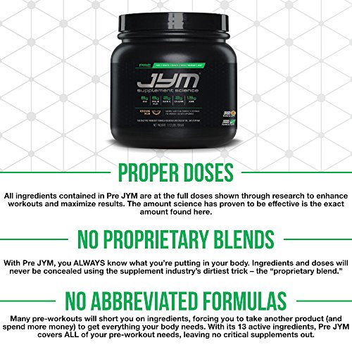 FULL TRANSPARENCY: With the proprietary blends found in other pre-workout products, you never know exactly what amounts you're putting into your body. Pre JYM contains NO PROPRIETARY BLENDS - what it says on the label is what's in the scoop