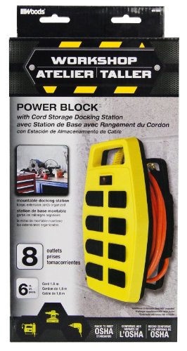 Woods 041750 8-Outlet Workshop Power Block with Cord Storage Docking Station, 15-Amp, 6-Foot Cord. The Woods Power Block includes 8 grounded outlets, 6ft power cord, hinged safety covers to protect unused outlets from dust and debris, and a handy built-in handle that allows you to carry the Power Block to wherever you need power or additional outlets. The Woods Power Block features a docking station that is wall-mountable and keeps extension cords organized. Use the docking station to keep the Power Block off of floors, counters and tabletops. This allows you to free up your workspace and keep a safe and tidy environment in the workshop, basement, or garage. Meets all OSHA requirements. Limited 1-Year Warranty. If you have immediate questions about application, installation, troubleshooting, or a damaged component, please call CCI Consumer product hotline at 1-800-561-4321 or email questions to: consumer.serviceatcolemancable.com. The Woods (R) brand is a registered trademark of Coleman Cable Inc.