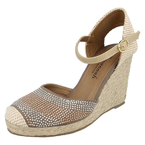 Binding : Apparel Product Description Womens wedge sandals with decorative bead detail. Ideal for casual fashion summer wear. Ankle strap with buckle fastening. Closed toe. Wedge heel height (approx): 3.75in. Upper: canvas. Lining: textile. Out sole: synthetic. Choice of two colors. 0