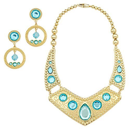 Multifaceted and multi-shaped aquamarine-colored jewels in gold-colored setting
