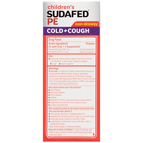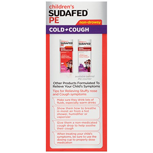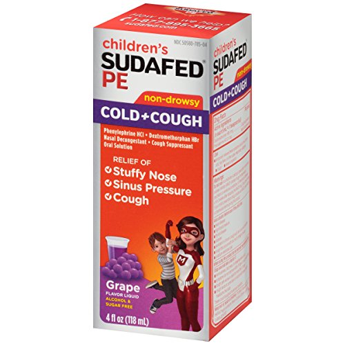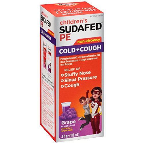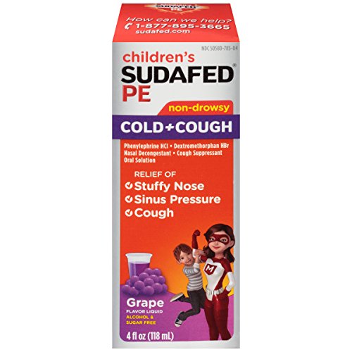 -. Binding : Health and Beauty -. Brand : Sudafed -. EAN : 0300450538048 -. Feature : Temporarily relieves symp due to common cold, hay fever, and other upper respiratory allergies / Provides relief from cough and nasal congestion / Contains dextromethorphan HBr and phenylephrine HCl / Non-drowsy formula with grape flavor / Intended for ages 4 and up -. Label : Johnson & Johnson SLC -. Manufacturer : Johnson & Johnson SLC -. PackageQuantity : 1 -. ProductGroup : Pantry -. ProductTypeName : HEALTH_PERSONAL_CARE -. Publisher : Johnson & Johnson SLC -. Studio : Johnson & Johnson SLC -. Title : Children's Sudafed Pe Cold+Cough Grape Flavor Liquid, 4 Fl. Oz -. UPC : 300450538048