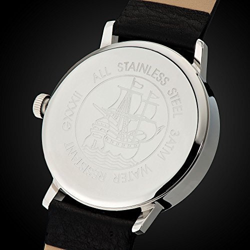 Massives Edelstahlgehäuse: Das Gehäuse der Uhr besteht aus massivem Edelstahl (316L), der besonders säure- und korrosionsbständig ist. Die Detailverliebtheit zeigt sich auch bei dieser Uhr im geprägten Gehäuseboden, den das markentypische Gigandet Schiff kennzeichnet.