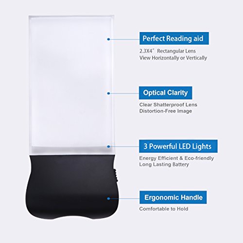 - ★LIGHTWEIGHT & ERGONOMIC HANDLE: The handle of this hand held LED magnifier is ergonomically designed to grip/hold for most hands, therefore, it is ideal for long reading time.