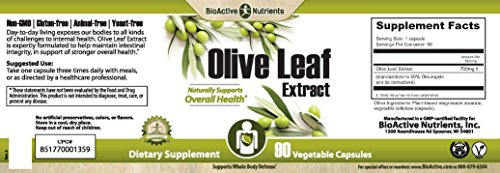 Studio : BioActive Nutrients Publisher : BioActive Nutrients Binding : Health and Beauty Product Description erving Size: 1 capsule Servings Per Container: 90/180 Ingredients Amount per Serving Olive Leaf Extract 700 mg† (standardized to 20% Oleuropein and its derivatives) †Daily Value not established Other ingredients: Plant-based magnesium stearate, vegetable cellulose (capsule). Suggested Use: Take one capsule three times daily with meals, or as directed by a healthcare professional. Notes: This product contains no artificial preservatives, colors, or flavors. Unconditionally guaranteed for purity, freshness and listed potency. Store in a cool, dry place. Keep out of reach of children. 0