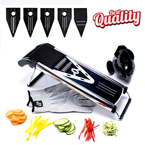[Improved] Vegetable Mandoline Slicer V-Blade + FREE Cut-Resistant Gloves | Stainless Steel Adjustable Mandolin Slicer, Julienne Cutter | Includes 5 Inserts, Food Holder, Blade Guard & Safety Sleeve