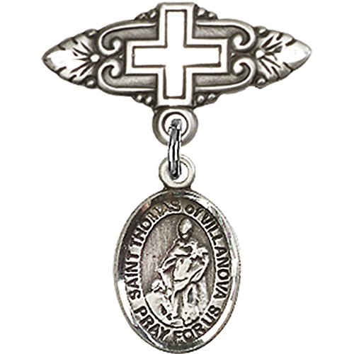 -. Title : Sterling Silver Baby Badge with St. Thomas of Villanova Charm and Badge Pin with Cross 1 X 3/4 inches