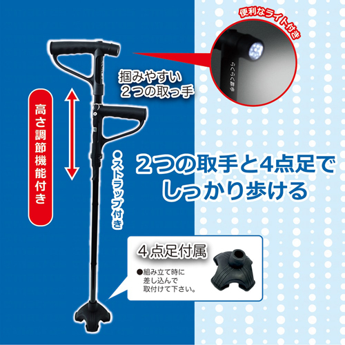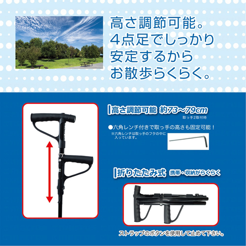 ●2つの取っ手と4点足で抜群の安定感の折りたたみ式杖