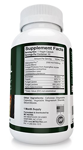 Studio : MIT NUTRA Publisher : MIT NUTRA Binding : Health and Beauty Product Description Digestive enzymes are produced by the pancreas and secreted into the duodenum (upper small intestine) where proteins, carbohydrates, and fats are broken down prior to absorption. The body's capacity to produce enzymes may decline with age. Moreover, stress and other unhealthy lifestyle factors may impact enzyme production. The enzymes in Digestive Enzymes help support the replenishment of the body's enzyme levels, promoting healthy digestion and delivery of vital nutrients to the body. Maintenance of healthy digestion not only helps with occasional gastrointestinal discomfort, but also supports the very integrity of the intestinal mucosa. Additionally, enzymes may enhance healthy bacterial balance in the bowel by lessening the accumulation of undigested foods in the large intestine.