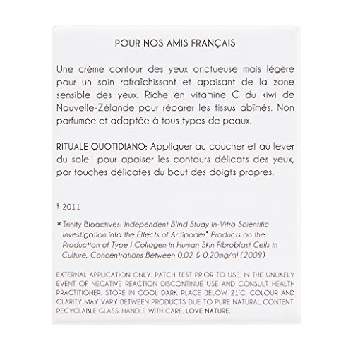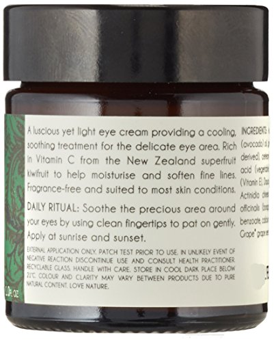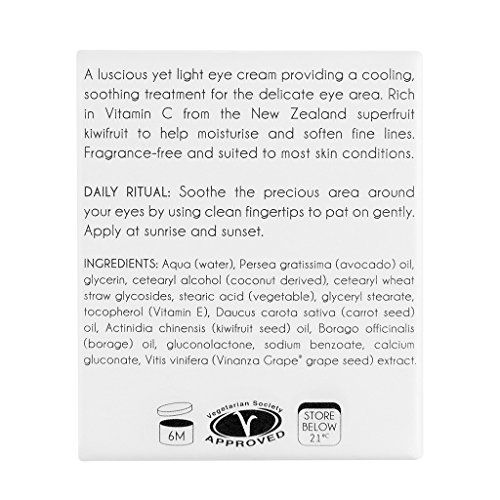 A luscious yet light eye cream for a cooling, soothing sensory experience.Ultra-rich Vitamin C from the seed of the New Zealand Kiwi fruit works superbly to help repair damaged tissue. Containing carrot seed oil, aloe gel and 100% pure avocado oil, this is a fragrance-free product your skin will love.Elements of Beauty: Kiwi seed oil helps restore delicate tissue, aloe vera plant gel both cools and calms, jojoba oil conditions.Daily Ritual: Apply to the delicate area around the eyes at sunrise and sunset, and any time between.Scientifically shown to stimulate synthesis of collagen production in human skin cells by up to 82%.Suited to most skin conditions.Feature
