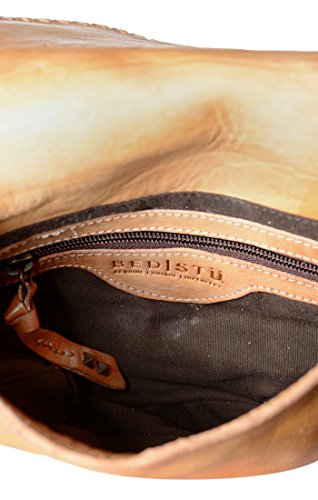 The Bed Stu® Halfmoon Bag is the ultimate accessory! Made of full grain leather with perforated detail. Removable crossbody and wrist straps. Front zip pocket with fold-over flap with magnetic snap closure. Interior features two zip pockets, six credit card slots,and an ID window. Imported. Bed Stu Belt Size Guide Measurements: Bottom Width: 8 in Depth: 2 in Height: 6 1⁄2 in Strap Length: 54 in Strap Drop: 26 in Weight: 14.6 oz