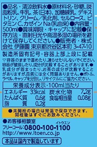 原材料:砂糖、脱脂粉乳、牛乳、茶(日本)、加糖練乳、デキストリン、クリーム/乳化剤、セルロース、ビタミンC、カゼインNa(乳由来)