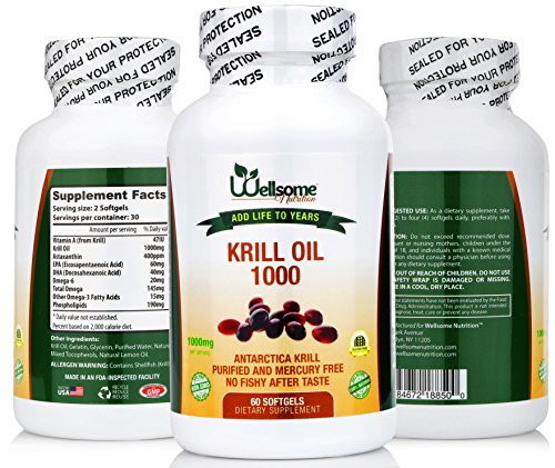 - Feature : IMPROVES OVERALL HEALTH: Krill oil can improve cardiovascular health, regulation of blood pressure and joint support / 100% ALL NATURAL: Wellsome Nutrition products are gluten free, GMO free, contains no fillers, binders or any artificial ingredients at all. It is a completely natural and healthy / HELPS WOMEN WITH PMS SYMPTOMS: Krill Oil is Great for reducing the symptoms of PMS that women suffer froms such as cramps, fluid retention and mild mood swings / FDA -INSPECTED & USA MADE: All Wellsome Nutrition vitamin supplements are made and manufactured in the USA. All our products are also FDA-inspected and made in a GMP-certified facility with the highest certification. / 100% SATISFACTION GUARANTEED: Wellsome Nutrition Vitamin Supplements will aid you in your journey to living a healthy active life. We guarantee it!