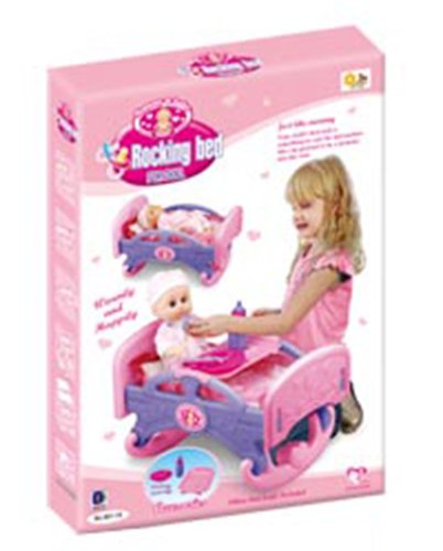 Your child's first doll is something to care for and nurture. With this Rocking Bed, she can pretend to be a mommy just like you! Time to put baby doll to sleep. Young girls will enjoy playing pretend Mommy while putting their infant dolls to sleep. Perfect for your baby dolls naptime. Rock the bed from side to side to put the baby doll to sleep peacefully. Accessories, Pillow and Quilt Included. Accommodates Dolls up to 14" Tall (Doll not Included). Ages 3 and Up.Feature
