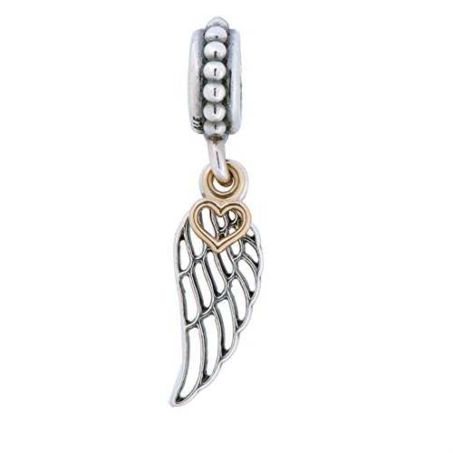 Crafted from sterling silver and adorned with a glimmering 14K gold heart, this two-tone filigree dangling angel wing charm symbolizes love and protection. It will make a meaningful addition to your bracelet ? or a great gift for someone you love.