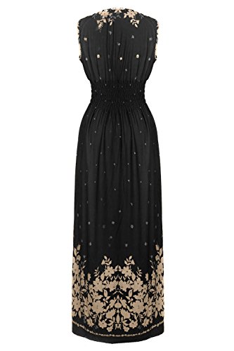 Sleeveless long smocked dress featuring a bohemian inspired bright bold printed pattern all throughout for the spring summer season. Surplice crossover v-neckline and a fitted smocked stretch construction accenuating the waistline. Ruched tie and smocked details at shoulders and a lengthy dress in a top quality medium weight jersey stretch knit for softness and comfort.Feature