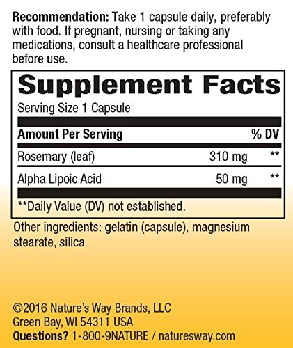 Suggested Use As a dietary supplement take 1 capsule daily, preferably with food - Or as directed by your healthcare professional. Supplement FactsServing Size: 1 CapsuleServings Per Container: 60Amount Per Serving% Daily Value***Rosemary (leaf)310 mgAlpha Lipoic Acid50 mg ***Percent Daily Values are based on a 2,000 calorie diet