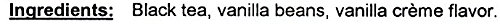 -. Feature : Vanilla Crème Tea- Smooth and delicious loose vanilla crème black tea! / Black tea with vanilla beans and vanilla crème flavor. / Good early to mid- morning tea. Drink hot or cold! / High caffeine. Perfect breakfast tea! / Being in the World®: Mahamosa donates 50% of after-tax net profits to charity!