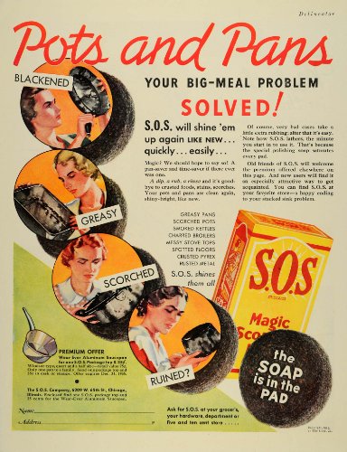 -. Title : 1935 Ad SOS Magic Scouring Pads Polishing Soap Pan Pots Female Cleaning Saucepan - Original P.R.Int Ad