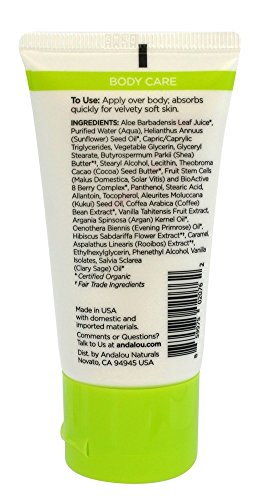 Studio : Andalou Naturals Publisher : Andalou Naturals Binding : Health and Beauty Product Description Kukui Cocoa Nourishing Body Butter Travel Size 1.7 fl oz LiquidProduct Description This luxurious body butter blends argan oil with shea and cocoa butters to nourish, smooth, and soften the appearance of dry skin. Hawaiian kukui, evening primrose, and superfruit antioxidants blended with ultra-hydrating aloe vera help pamper and protect skins moisture barrier for an all-over body treatment.