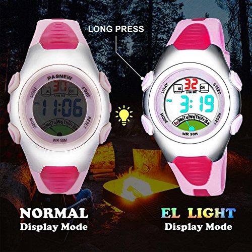 -. Feature : Girls Digital Watch - Take precise quartz movement and LED digital movement to display dual time at the same time the clock hands and LED digits, ideal for overseas travelling. / Available Waterproof Watch - 3ATM water resistant, hand wash, rain day, sweating, no problem! NOTE: Please DO NOT press any button under the water. Using in extreme hot or cold temperature will damage leather band and shorter watch life. / Multi-Functional Watch for Kids - Display Week/Time/Date, EL night-light, Stopwatch, Alarm, Chime, 12-hour/24-hour time format for choice. / Sports Watch with High Material - Durable hard plastic, stainless steel and soft rubber. / Digital Watch Suits for Girls Age from 5 years.