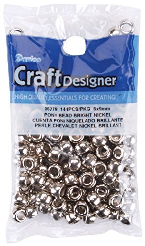 Pony Beads. This package contains 144 9" x 6mm nickel plated plastic pony beads. Recommended for children ages 6 and up. WARNING: Choking Hazard-small parts. Not for children under 3 years.