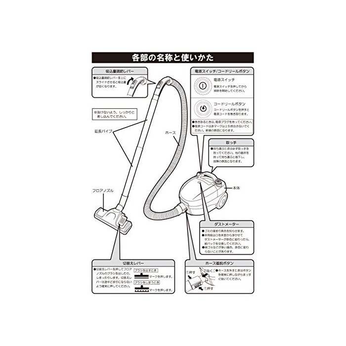부속품:빈틈 노즐,플로어 노즐,지팩×2(1 매본체 부착1 매예비)고, 연장 파이프×2,호스,취급 설명서(보증서)