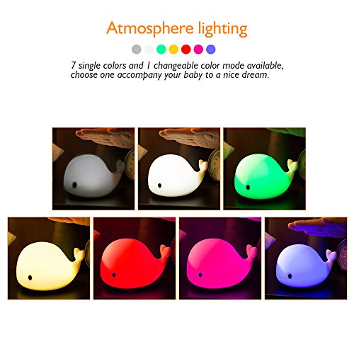 - [4 Light Modes & Tap Control]: First, press power button on the bottom to turn it on/off. Need change color, then tap the back of dolphin to switch among soft white light, bright white light, 5 single color lights and 5-color breathing modes. Pretty sensitive, which allows you to control lights at will, making it a gentle guardian at night.