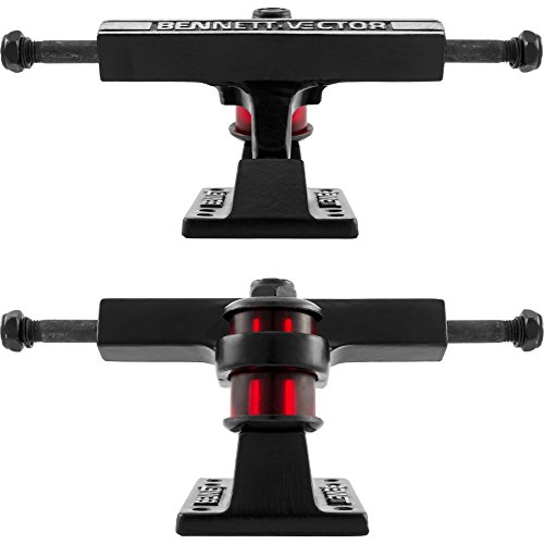 Studio : Bennett Trucks Publisher : Bennett Trucks Product Description Continuing the 1970's legacy, the folks at Bennett have brought their iconic brand back to the market with the updated Vector TM truck line. Sand-cast in the USA and built with the tall style cushions, Bennett trucks will turn on a dime and make surfing streets and carving banks a blast. Excellent choice for a turny ride -- a favorite for Slalom and LDP set ups. Specs: Available in three stock sizes: hanger dimensions: 4.3 = 109mm (overall width 7" axle nut to axle nut), 5.0 = 127mm (overall width 7 5/8" axle nut to axle nut) and 6.0 = 152mm (overall width 8 5/8" axle nut to axle nut) and two finish colorways -- Silver or Black. Please specify choice of size and finish when ordering. Ships stock with clear red Bennett urethane bushings (90a). Baseplate features both old school and new school mounting patterns. 0