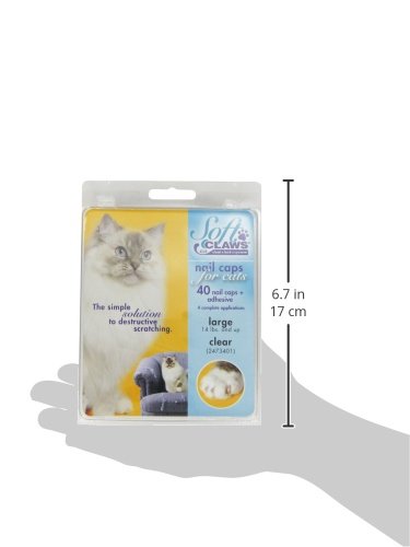 Feline soft claws nail caps take-home kit helps customers protect their homes against destructive scratching by applying soft claws nail caps to their pets' nails. A great add-on to your routine professional nail care. This is simple, non-surgical alternative to declawing. Easy-to-apply caps last 4-6 weeks and will not interfere with pet's normal behavior. Non-toxic nail caps are safe if swallowed. Feline take-home kit includes 40 nail caps, adhesive, 6 applicator tips and instructions. Steps for application - Trim the tips of cat's nails. Fill nail caps 1/3 full with adhesive. Extend nails by gently pressing on top with the index finger on the bottom of the paw. Observe cat for five minutes before release. Approximately 14-pounds and up. Very large-boned and large-breed cats wear large. Maine Coons, for example, are very large cats and generally wear large. Measures 6-4/5-inch length by 5-inch width by 1-4/5-inch height. Available in large size with clear color.Feature