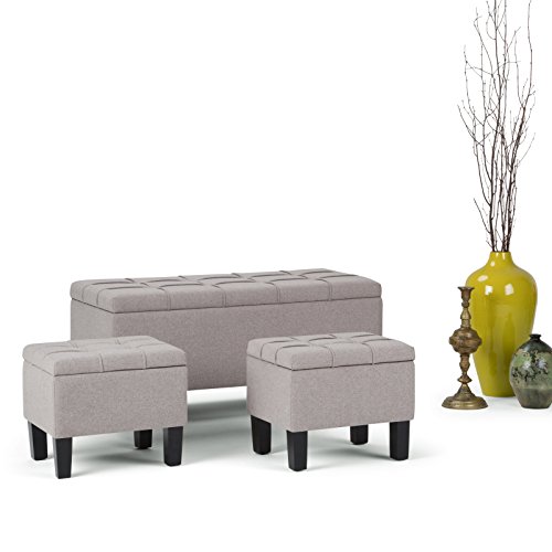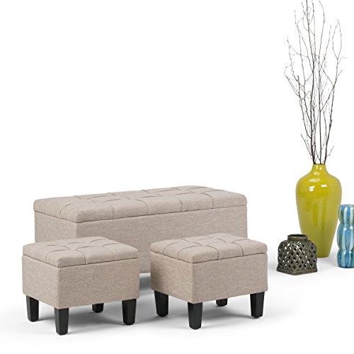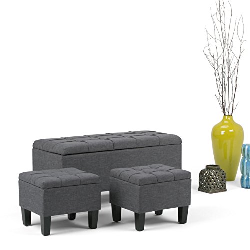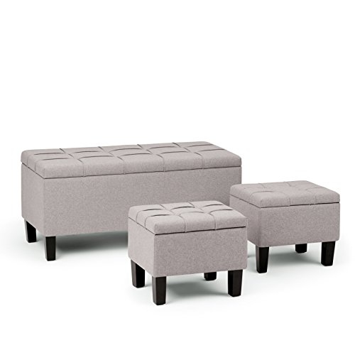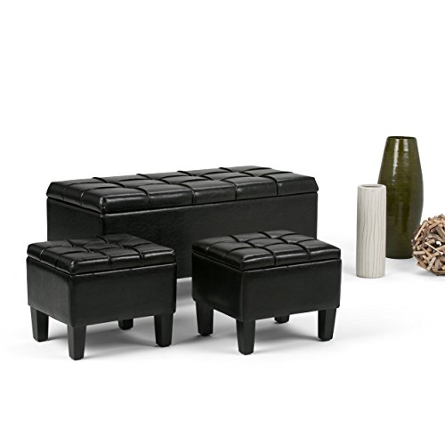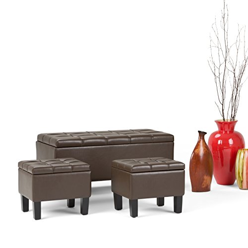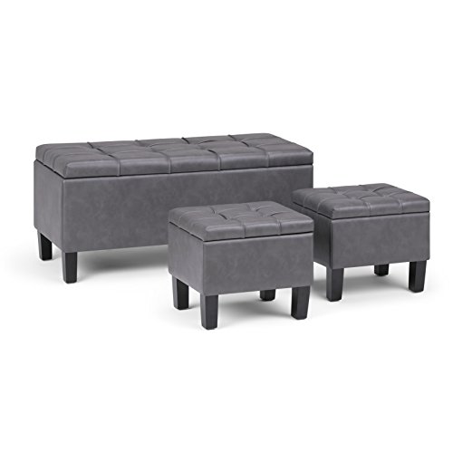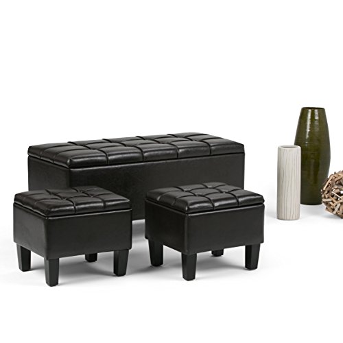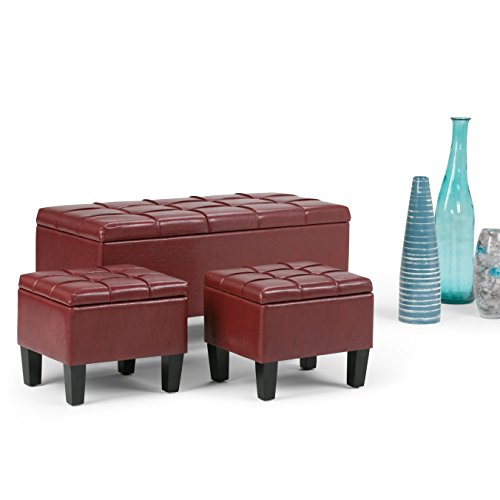 Studio : CCT Global Sourcing Publisher : CCT Global Sourcing Product Description This beautiful ottoman set offers three practical ottomans for added storage and organization, while lending a modern accent to your living space. Perfect for extra seating, foot rest, table and more, this set will lend a contemporary touch to any motif. Available in dark brown, radicchio red, slate grey, natural, and midnight black Materials: Wood/ faux leather Durable tufted design Convenient and flexible 3 piece ottoman set Set includes: One (1) large rectangular ottoman/ two (2) smaller ottomans Tops easily lift to reveal storage compartmentsLarge dimensions: 20 inches high x 19.5 inches wide x 44 inches longSmall dimensions: 17.5 inches high x 15.5 inches wide x 15.5 inches deepAssembled 0