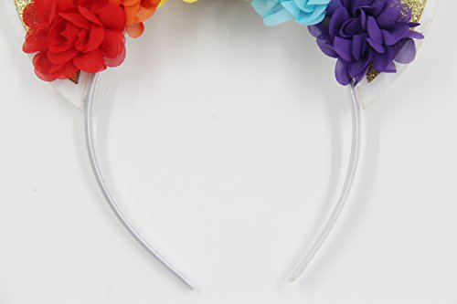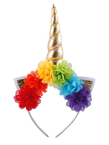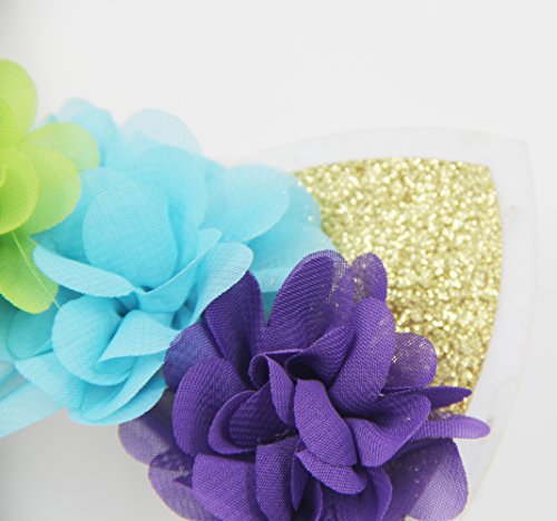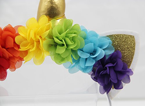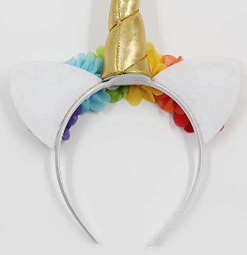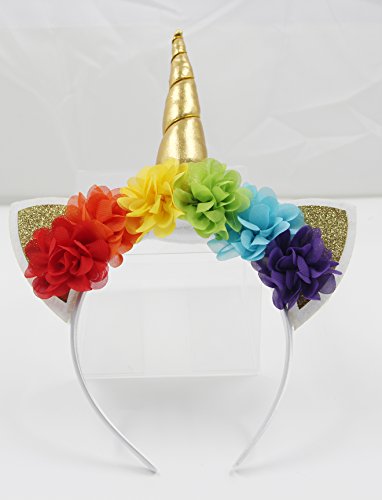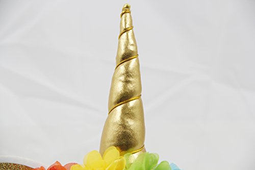 - Material:shiny,cloth,chiffon.Size:6 inch high .Package includes : Chiffon Gold Unicorn Hair Hoop .